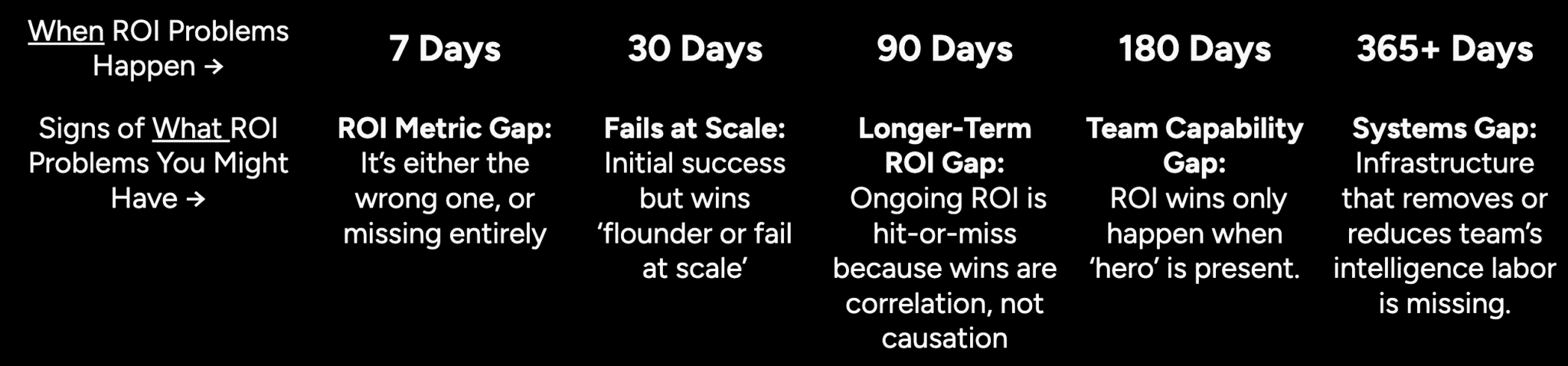 Now, this is good news, because if you fix the process, then ROI shows up. However, in our experience, most people rush to prescribe a ‘fix’…but don’t slow down and run deeper diagnostics to make sure they’re even solving the right problem.